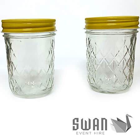 Mason Jars can be used as glasses, vases, candle holders or as part of a table centrepiece. Here is it’s lid… in daisy yellow. They can be used in almost any kind of decorative feature. Have fun and be creative! Jars to be hired separately.