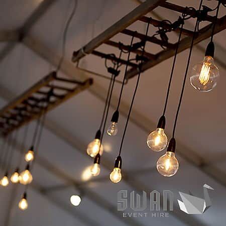 Industrial lighting hung through a rustic ladder. A simple but stylist way to light your event